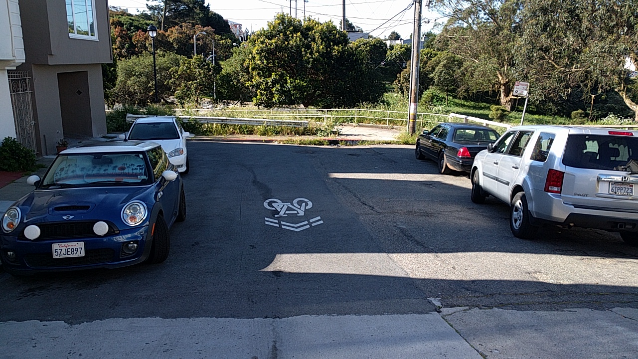 Behold, in the photo above, San Francisco bicycle infrastructure, at the end of St. Charles way, where it deadends at Brotherhood Way in Oceanview. There’s a walking path at the end that leads to Brotherhood Way. There’s a large curb.