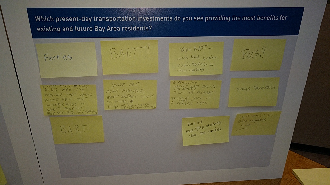 Held at the Joseph P. Bort MetroCenter Auditorium across from the Lake Merritt BART station, the open house consisted of half a dozen information stations, with representatives from a gaggle of area transportation planning agencies, including AC Transit, BART, Caltrans, Caltrain, MTC, and SFMTA, not to mention consultants, who heard public comments and discussed priorities for the Bay Area.