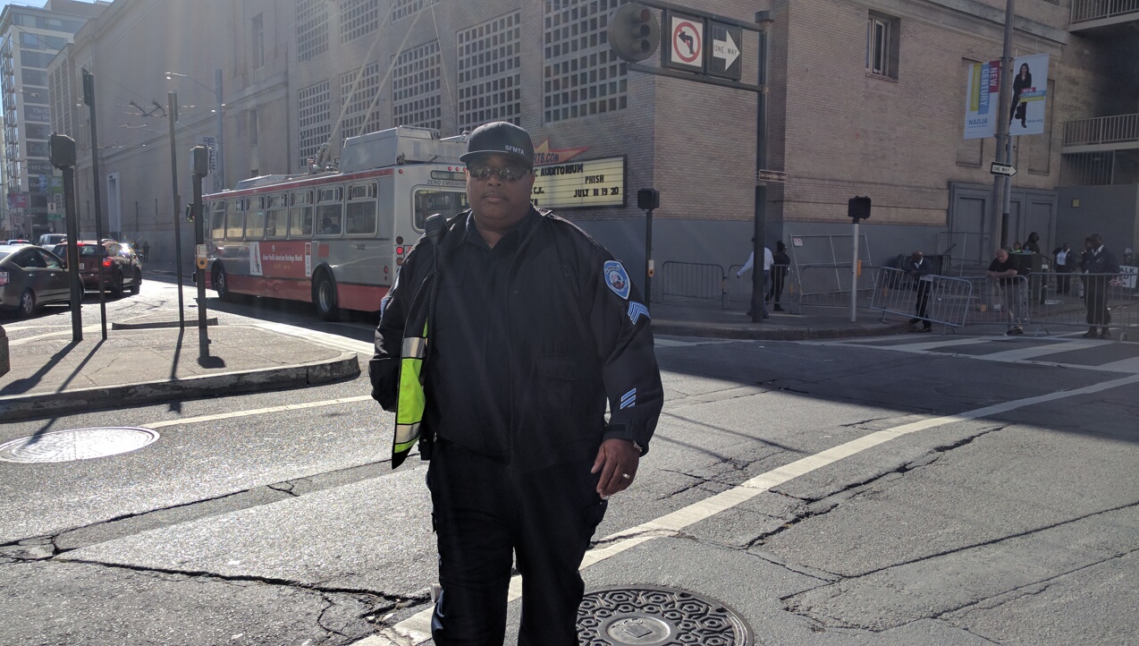 There were three SFPD officers standing there; two men and a woman. I explained what was going on. I identified myself as a journalist and an advocate. I asked if they could get him to move the car. The female police officer said his car was "exempt" and he was allowed to park there. I said "I believe you are mistaken, unless there is an ongoing emergency, which there apparently is not."