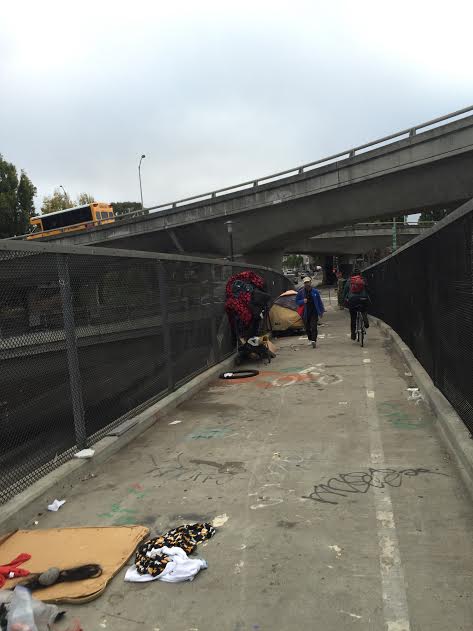 But the bridge is pretty much the only stretch where cyclists are completely separated from automobile traffic. It should be the safest part of the ride for Crosby and so many like him. Instead, bike riders how have to navigate around garbage and squeeze past tents and the homeless, many of whom have substance abuse problems, mental illnesses, or both. So why would homeless people want to camp in the middle of a bike lane, when there is so much empty land under the freeway and its ramps?