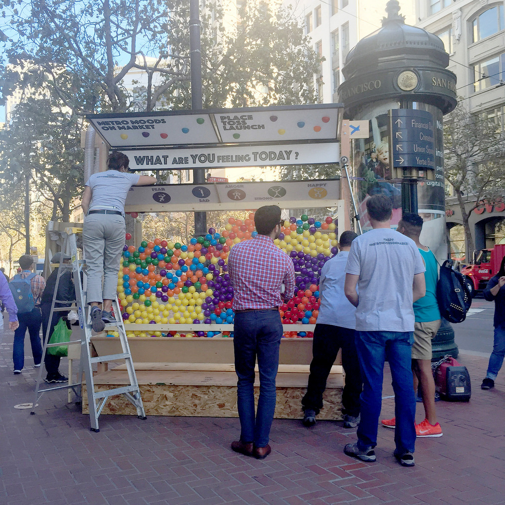 For the festival, artists from around the city were selected to put up temporary displays that promote conversation, some of which–if successful–can become permanent. Take the MMM Project, also known as Metro Moods on Market. This display shows different colored balls, or “mood balls” which passersby can pick up and drop into a display according to a color-coded mood chart. For example, people are instructed to drop in a green ball if they feel strong, or a brown ball if they feel angry, or yellow if they feel happy. The idea is the board shows the collective mood of the city as people walk by.