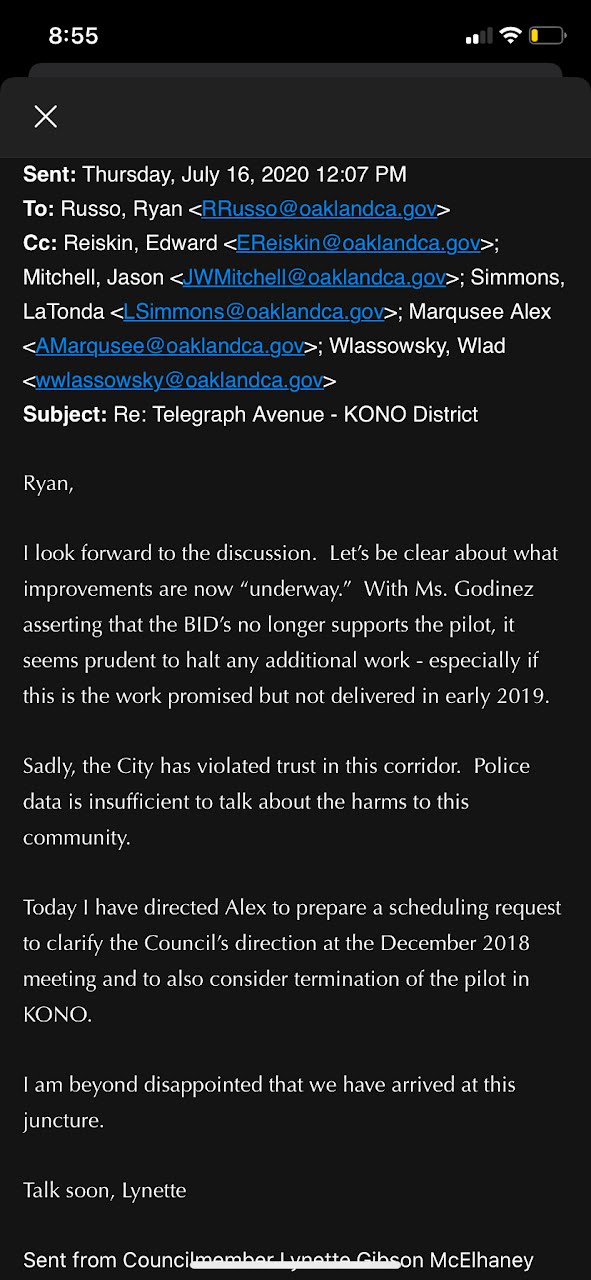 Sagehorn and others who spoke with Streetsblog pointed out that McElhaney is facing a tough re-election bid for the third district this November, and a merchants association on Telegraph represents a solid block of voters. McElhaney herself, meanwhile, did not immediately reply to a request for comment.