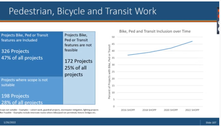 According to Caltrans staffer Mike Johnson, over time the number of complete streets elements in the SHOPP has been increasing – the department calculates that 46 percent of the 2022 SHOPP projects have some complete street element. That includes 50,000 crosswalks, 224 feet of sidewalks, 121 transit improvements, 167 bus bulb-outs.