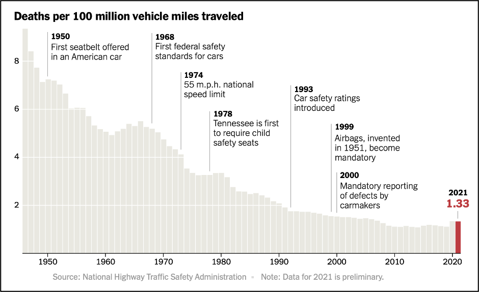 In both 2020 and 2021, U.S. car crash deaths increased, a phenomenon experts attribute to an increasingly large proportion of dangerous cars in the vehicle fleet, piloted by drivers who found themselves on dangerous roads designed for speed over safety — roads that became even more deadly by the absence of traffic jams during the pandemic. Unsurprisingly, rates of speeding and reckless driving soared, and deaths did, too — a trend which would appear far more dramatic in this chart, had the Times data department not included the decades when drivers were routinely impaled by their own steering columns for comparison.