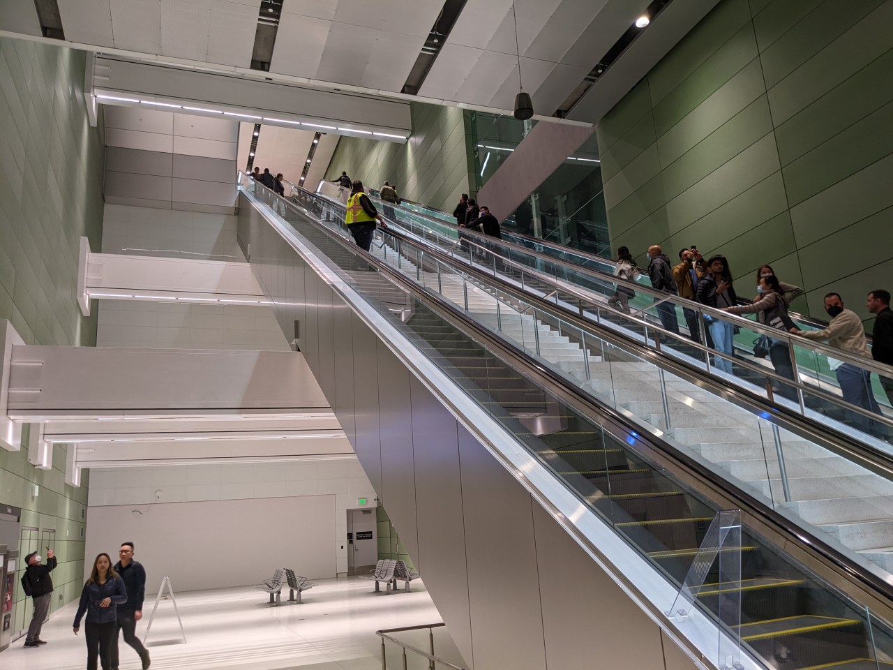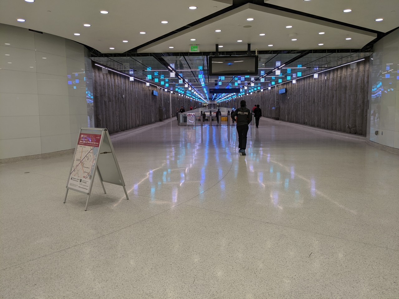 - The wayfinding/passageway from the existing Powell Street BART and Muni station is excellent. Transit designers have certainly learned a thing or two about lighting–the proliferation of LED lights has certainly helped–and making underground spaces inviting. The challenge now is will they be able to keep this pedestrian tunnel (below), as well as other spaces in the system, looking bright and clean over time.