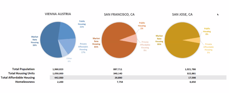 Vienna has a population of close to two million. It has about a million housing units. San Francisco has a population of about 887,000. But it only has 340,000 units. San Jose’s ratio of housing to population is even lower, as seen in the chart below.