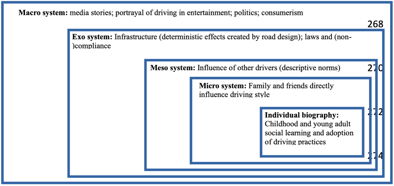 “As an individual, the layers [of influence] closest to us are the most important,” he adds. “But those outer levels influence everybody — especially that exo-layer that policymakers can control. If I could wave a magic wand and change a single thing, it would be getting [transportation leaders] to agree to change planning laws, environmental laws, and policing standards … Build a street where people can’t speed, and there will be a brief period of moaning and complaining. But you won’t have speeding.”