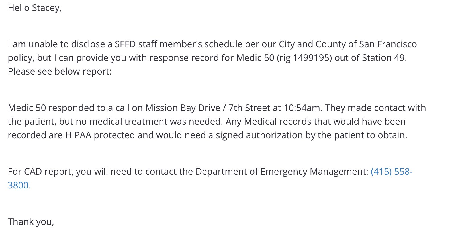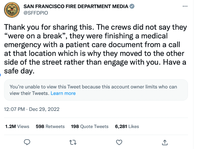 Correction, Feb. 1: an earlier version of this story said that the San Francisco Fire Department deleted its Tweet about the incident. The original Tweet was not deleted and can be found here.