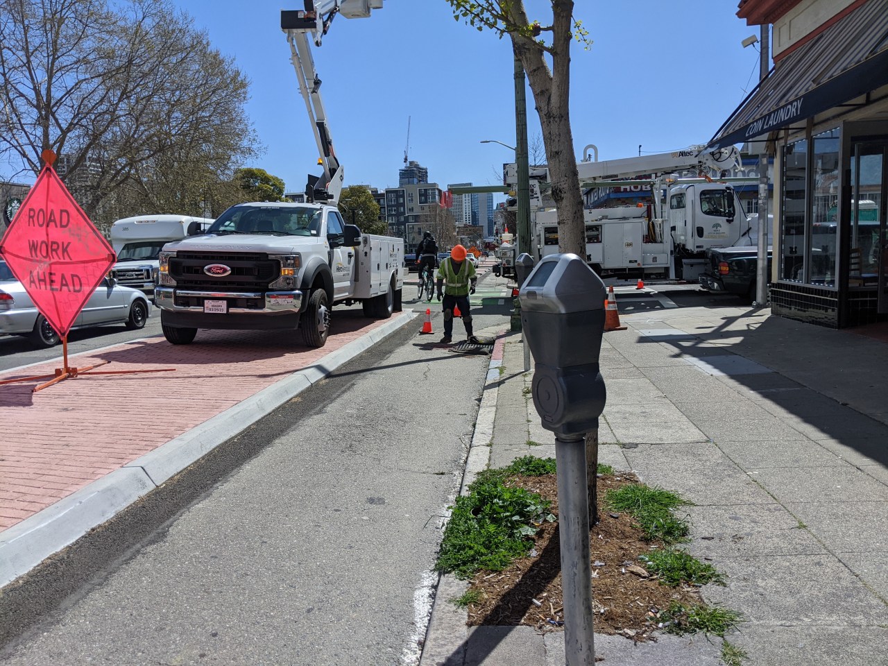 It’s nice on occasion to do an update on the construction of the Bay Area’s first real protected bike lane through a commercial district: on the Koreatown Northgate section of Telegraph, from Thomas Berkeley Way to 29th in Oakland.