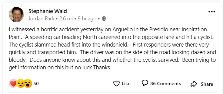 Streetsblog was sent the following Nextdoor post from eyewitness Stephanie Ward. The post is consistent with information provided by the Presidio: