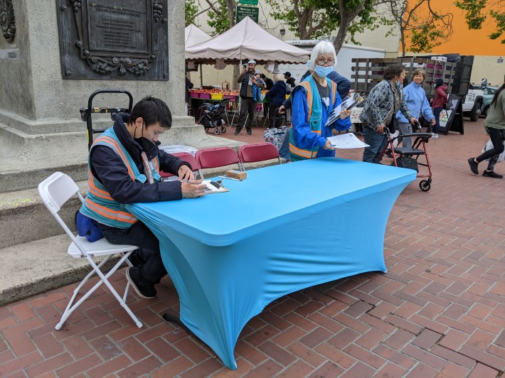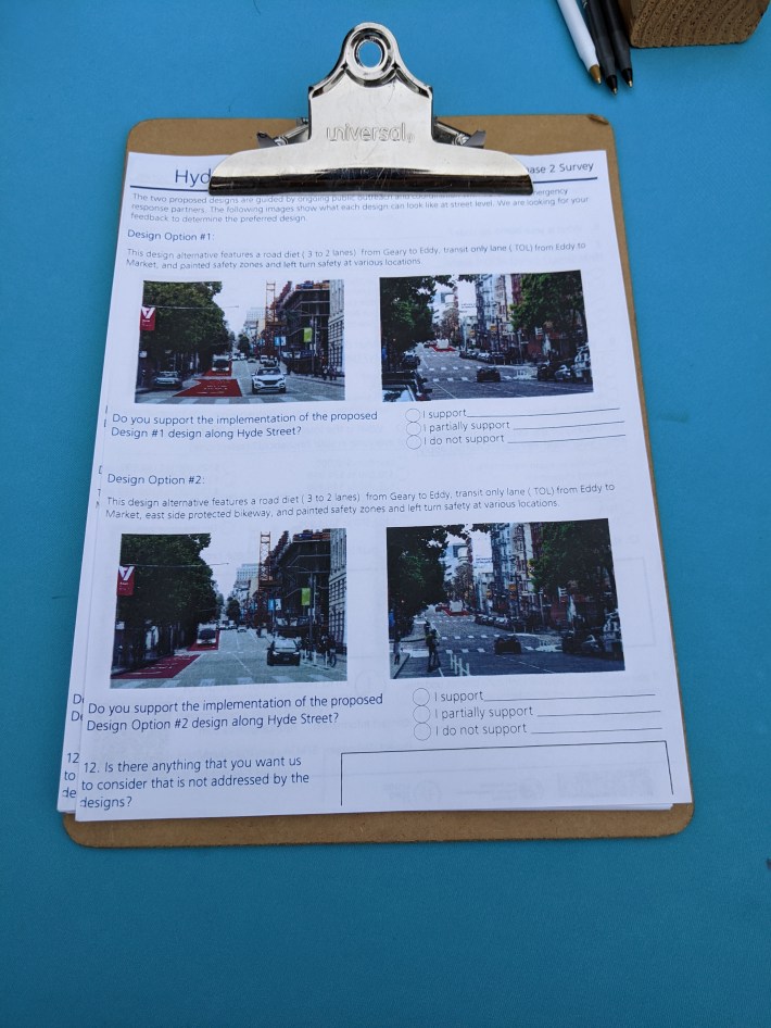 The unmarked “popup” table, which was in front of the Civic Center Farmers Market, was manned not by SFMTA staff, but by two people from the Tenderloin Community Benefits District. The two, who declined to identify themselves, knew nothing about the bike lanes; they didn’t have maps, diagrams, or any other information to provide except for a one-sheet survey page with photos of the street.