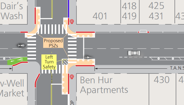 Above is a zoomed-in SFMTA diagram of the intersection at Ellis and Hyde. As cyclists approach the intersection (moving from right to left in the diagram, on a bike lane on the left side of the street instead of the right) they’re somehow supposed to magically shift into a potentially occupied traffic lane to their right (or up in the diagram).