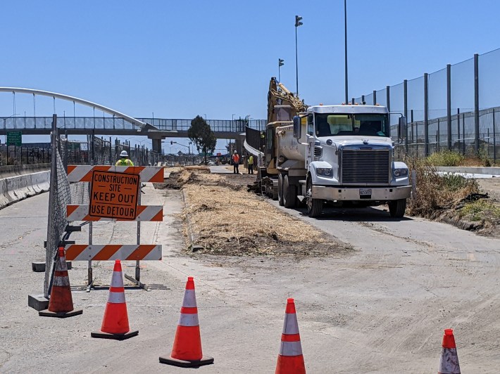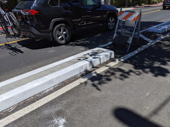 The on-Gilman two-way protected bikeway approaching the bridge is also taking shape and actually offers more robust protection than the video shows, as seen below: