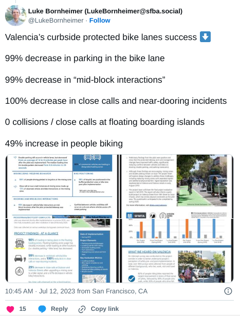 The real tragedy of all this: the city already piloted curbside, protected bike lanes on Valencia from Market to 15th. They’re not perfectly executed, but they follow the basic tenets of international best practices and they work for safety. SFMTA’s own data show dramatic decreases in close calls, bike-lane violations, and other safety hazards on those lanes, as noted in advocate Luke Bornheimer’s tweet below: