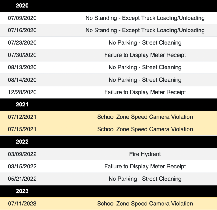 Simon’s plate also picked up speed camera tickets on July 12 and July 15 of 2021, as well as several parking tickets in Manhattan in 2020, bringing his total record of high crimes and misdemeanors (summonses, actually) to more than 96 tickets, with 81 coming in Baltimore.