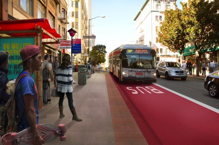 Let’s, however, not lose track of the fact that this was a giant bait-and-switch. See that nice lead image of a center-station for Geary BRT, much like what was accomplished on Van Ness? Well, Geary isn’t getting that. It’s getting more of this, from a rendering of the downtown section of the 38 “Rapid” project: