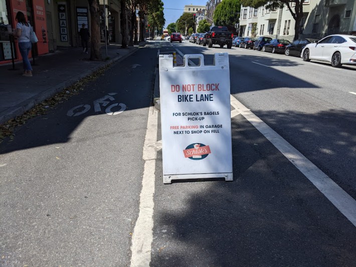 I was thinking about this while getting a bagel for lunch at Schlok’s Bagels on Fell Street last week, a notorious hot spot for bike-lane parking. I noticed the driver of a red Prius pull over and park in one of the many gaps in the “protected” bike lane. This was despite the fact that there was a clearly visible, empty parking spot in the garage next to Schlok’s.