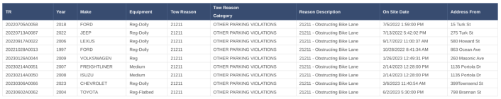 SFMTA’s Stephen Chun confirmed that the city can (and theoretically already does) tow cars for blocking bike lanes, but it’s extremely rare. He sent a list of nine cars towed from bike lanes in the fiscal year 2023 (see below).