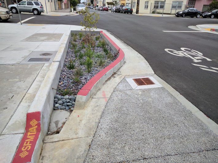 To its credit, San Francisco sometimes constructs concrete bulb-outs and rain gardens (see picture below) that shorten crossing distances and physically prevent people from parking at the corner. But these are expensive, involved projects, and the city also needs to figure out quick, inexpensive but effective treatments to physically prevent motorists from parking at corners and crosswalks.