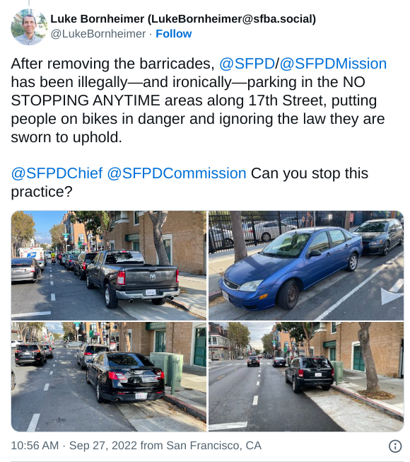 But much like painted bike lanes, what good are painted daylighting zones, when they are regularly violated (see the image at top, taken in front of the Mission District police station)? Such egregious behavior, often by cops parking their private vehicles, is commonplace.