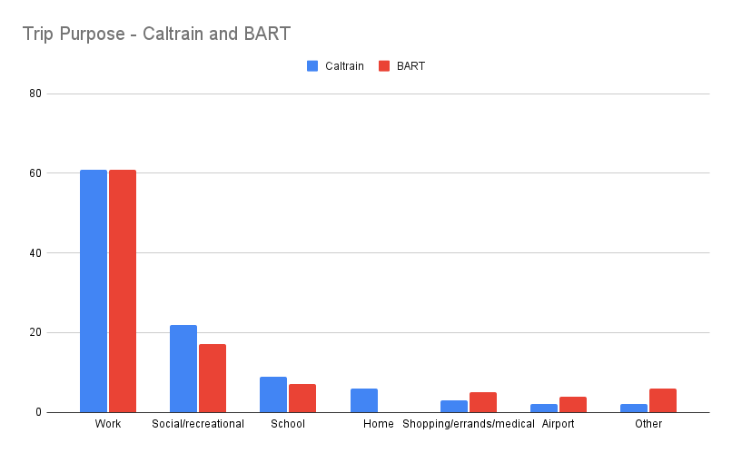 Recent customer surveys of BART and Caltrain riders show similar patterns in trip purposes and station access. Given the similarities, the customer research and ridership growth strategies are an opportunity for increasing functional integration and efficiency.