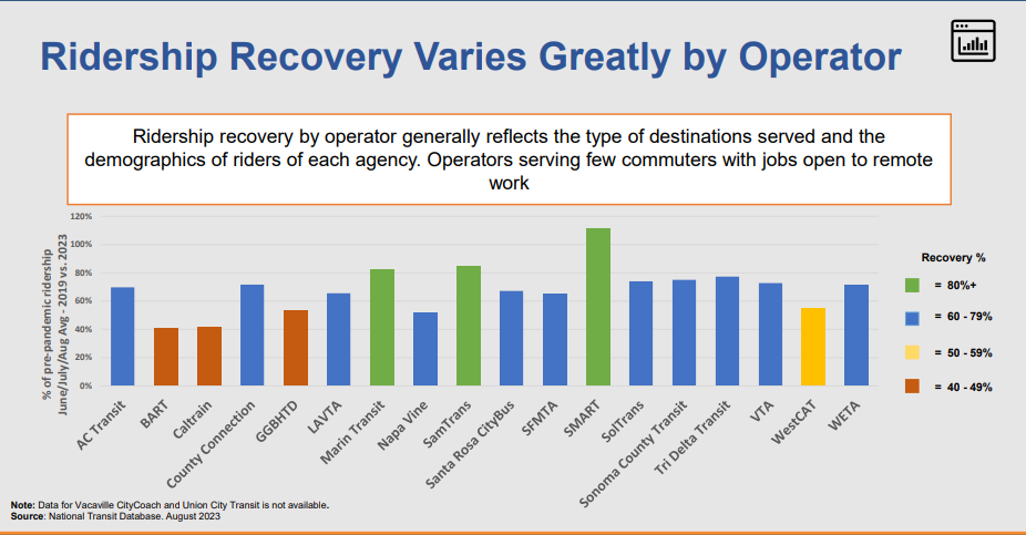 For both brands, ridership recovery strategies include attracting commuters back with institutional passes (including BART for the first time, and with the first ever regional all-agency pass); and supporting a greater diversity of trips with a less peak-focused schedule.