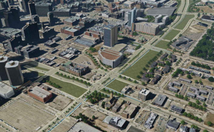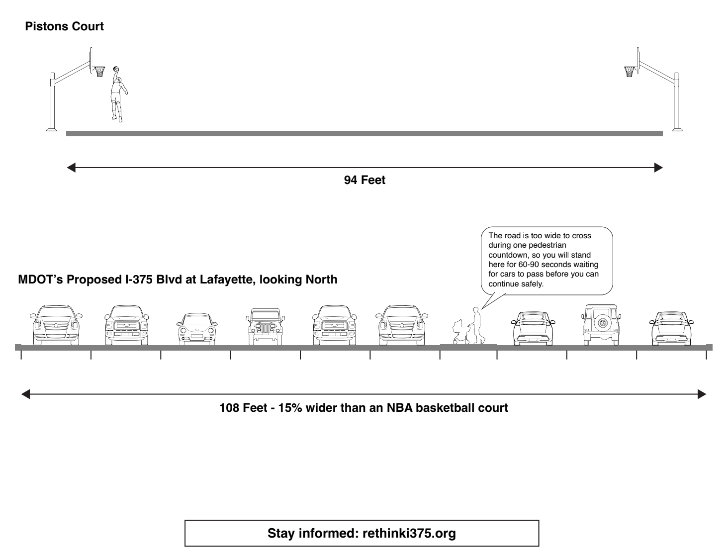Until he really dug around in the renderings, though, even Boyer — who heads U of M’s Bachelor of Science in Urban Technology — couldn’t tell that the road’s maximum width was 15 percent wider than the Pistons’ NBA court is long. An anonymous community site dedicated to sharing details about the opposition to the project, Rethink I-375, refers to it as “highway by another name.”