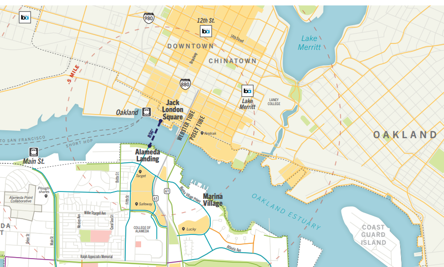 Hours of operation for the pilot are still being worked out, but the plan is to operate four to five days per week, for nine to 12 hours per day, depending on funding and the season. The service will be free to riders. Funding is coming from Alameda County, the city of Alameda, and various not-for-profits and local business interests. Currently, they have “$2.5 million for a two-year service,” explained Wheeler.