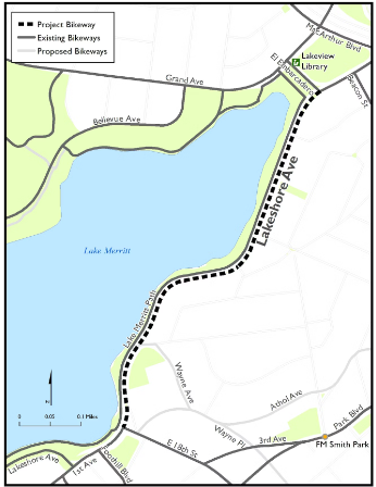 The two-way separated bike lanes will be located on the lake side of Lakeshore Avenue and [be] separated from motor vehicle traffic by a physical barrier. On-street parking along that physical barrier will provide additional separation between bicyclists and drivers.