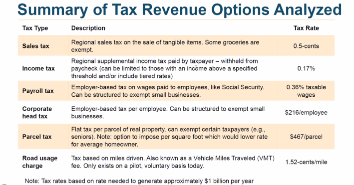 Meanwhile, MTC staff is still trying to figure out what form the tax measure will take. Sales taxes and various income taxes were discussed. Long also said the measure might be broken into several different taxes over time.