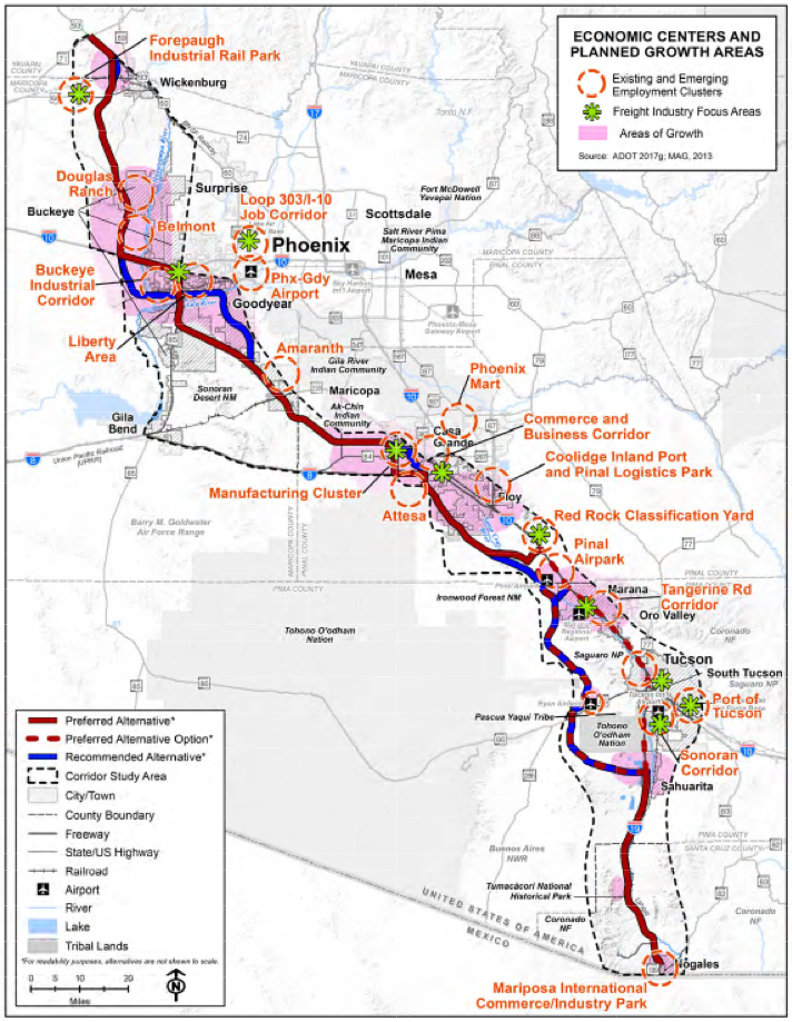 Going through human habitat, though, isn’t a good option either. While it may be possible to route the highway to the east of the parks by simply combining the Tucson stretch of I-11 with the stretch of I-10 that already carves through the city, that could mean deepening a divide that already cleaves many Hispanic communities in two — especially if officials elect to widen the road without tunneling it underground.