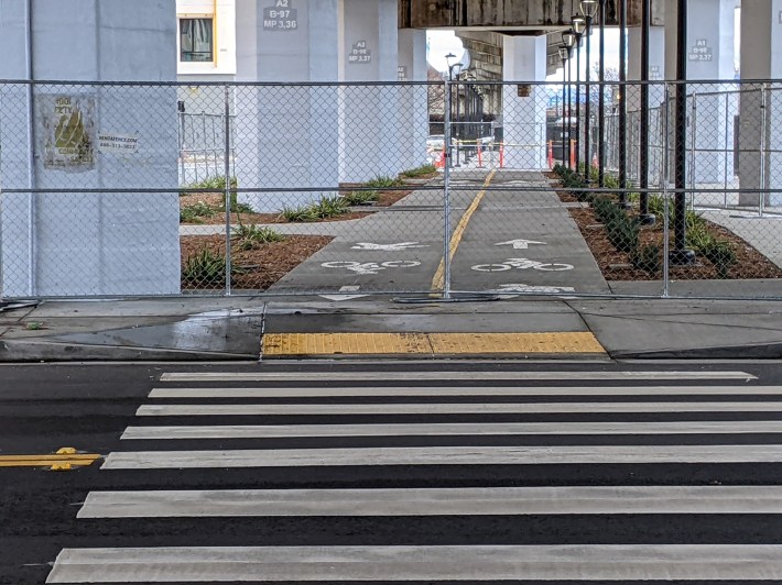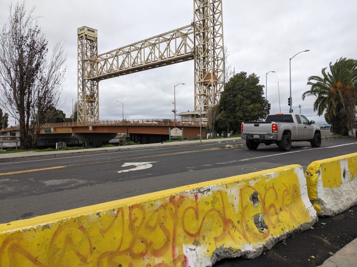 Meanwhile, Alameda Avenue, which feeds into Fruitvale Avenue on the bridge side of the project, got a bunch of “quick build” concrete protection — but not to protect cyclists. In fact, as seen in the picture below, for all intents and purposes Oakland built a protected bike lane on Fruitvale, except it’s too narrow to cycle in. That’s because the barriers are to deter encampments. It underscores how cities could provide quick-build protected cycle tracks while they work on these longer-term projects, the way Paris and other cities do it.
