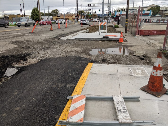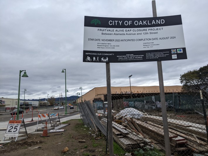 For more on the FruitvaleAlive project, check out past coverage in Streetsblog and coverage in The Oaklandside. Two more pictures of the ongoing construction below. As the sign says, the project should be finished in August of this year.