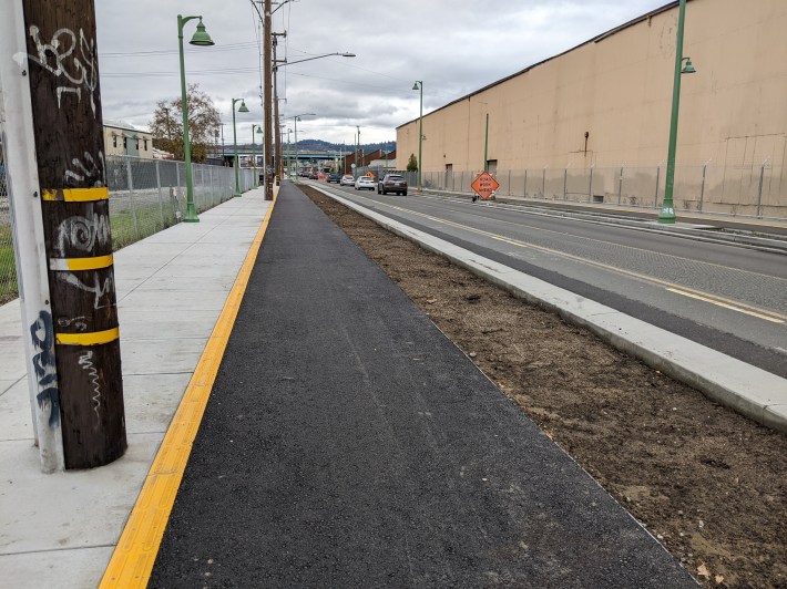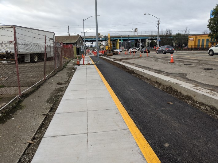 It’s been a couple of months since Streetsblog took a visit to the Fruitvale Alive project, but visible progress continues. Most recently: the connection to the Jingletown section of the Bay Trail is now open (see lead image) and the raised sidewalk-level bike lanes are now well-under construction on both sides of the street connecting the Bay Trail, Fruitvale BART (well, almost, more on that below) and the Fruitvale Avenue bridge to Alameda.