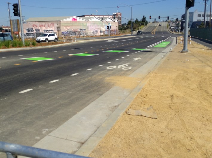 This is just like the bogus bike lanes on the I-880 29th and 23rd Avenue Overcrossings project in Jingletown, done by the same agencies (see image below) that painted little green boxes across off-ramps of screaming, high-speed traffic and called it “multimodal.”