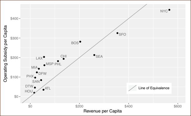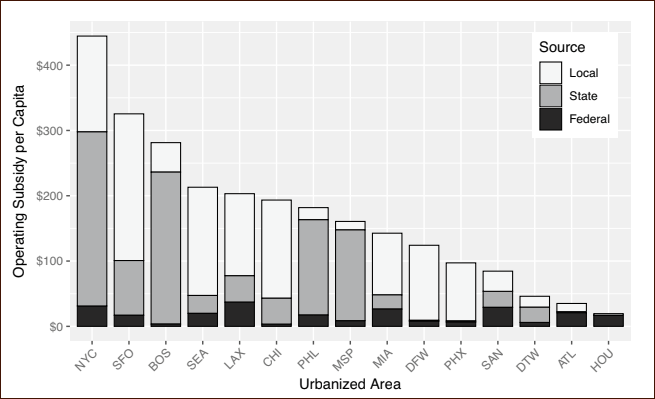 Finally, Newmark’s analysis looked at how much subsidy each transit system receives per capita, rather than per rider, as well as whether that subsidy was likely to come from federal, state or local sources.