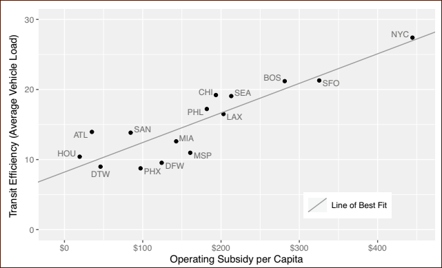 In a fascinating recent analysis, researchers found that metro areas that received more government subsidies per capita were more likely to run buses and trains with lots of passengers on board, rather than running inefficient, wasteful routes with just a few heavily subsidized riders per vehicle.