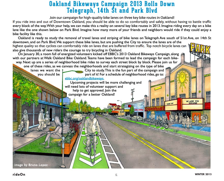 Not content with waiting, we at Bike East Bay (then called the East Bay Bicycle Coalition) in partnership with Walk Oakland Bike Oakland launched our own “Oakland Bikeways Campaign” with a focus on bringing continuous bike lanes to three corridors: Telegraph Avenue, Park Boulevard, and 14th Street. Our very first campaign meeting was hosted on January 30, 2013.