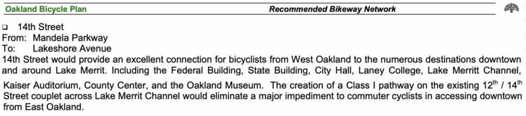 Oakland’s very first bicycle plan, adopted in 1999, included this recommendation for 14th Street as a “short-term priority bikeway” targeted for completion between 2000-2007. An infrastructure type was not proposed, but nevertheless no bikeway was built on the corridor.