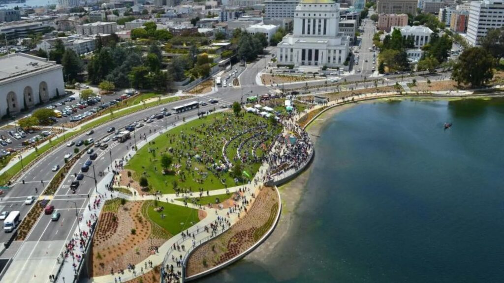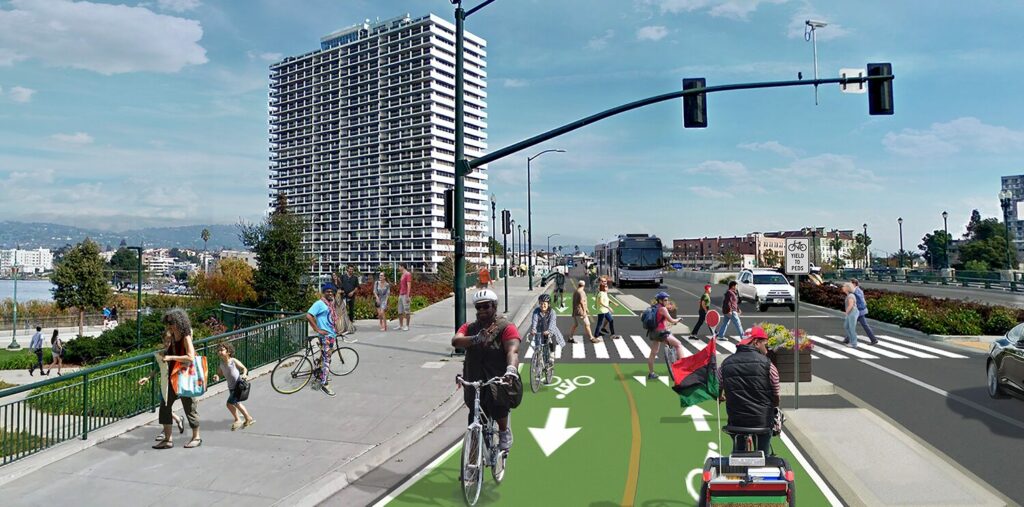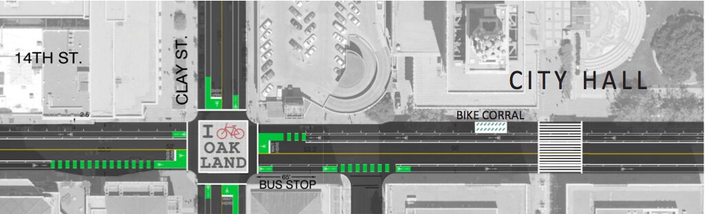 The long-awaited project includes concrete and landscaped planter-protected bike lanes across Downtown Oakland from 980 to Lake Merritt, six protected intersections, widened sidewalks, bus-boarding islands and shelters, updated street lighting, public art, and many more features. Learn more about the project here and sign up for updates.