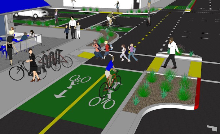 There are over 70 more protected bikeway projects in development throughout the East Bay right now, such as the Lake Merritt Blvd cycletrack project (shown below) which will connect to 14th Street and loop around the south side of the lake.