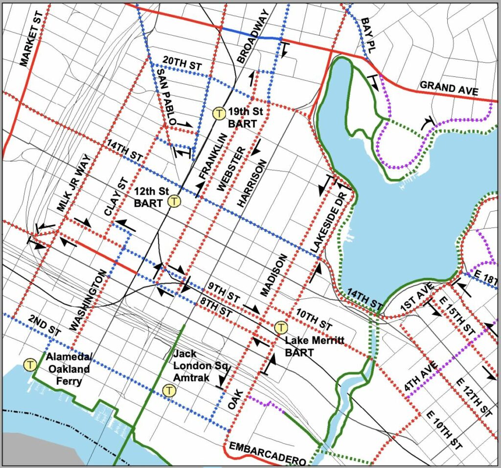 14th Street was also identified as a priority bike route in Oakland’s 2007 bicycle plan update. The segment through Downtown included a recommendation for painted bike lanes west of Jefferson and shared bike/car lanes east of Jefferson to Lake Merritt.