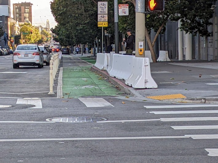 Take Arguello, which was repaved, restriped, and given a safety project in 2019. But rather than provide concrete-protected bike lanes and intersections — which also make streets much safer for pedestrians — SFMTA repainted the same, near-useless bike lane stripes.