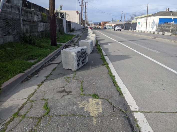 It shouldn’t be like this. More and more, concrete barriers and blocks, used in other cities to prevent speeding and other forms of reckless driving, are popping up all over Oakland, as seen in the lead image of Alameda Avenue in Fruitvale. But they’re not being used to prevent speeding, provide refuge on crosswalks, slow turning movements, or keep drivers out of bike and bus lanes.