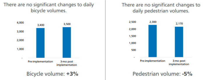 However, both figures are well within the margin of error — meaning the installation of the center-running bike lane had no tangible impact on bike and pedestrian numbers on the corridor. This is, however, an increase over the roughly 50 percent drop in cycling rates on Valencia measured last fall.
