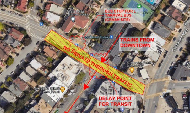 There should be concrete and steel diverters forcing drivers off West Portal Avenue in one direction and off Ulloa in the other so they don’t cross in front of trains coming in and out of the tunnel (see above diagram). That would eliminate a major delay for Muni and give people more incentive to take transit and not drive in the first place. This is a zone with way too many pedestrians, including families with children, scrambling back and forth to tolerate a free flow of traffic.