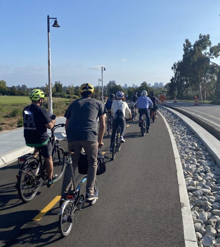 And although there is always more work to do, kudos to the city for what it has already built: protected bike lanes around downtown, a more connected bike network throughout the city, and progress on a two-way bikeway in Balboa Park that transforms the experience from a death-defying freeway ride to a bucolic sweep through the park. Participants even got to walk through the fenced-off, unfinished portion of that bikeway to see what it will be like in the near future.