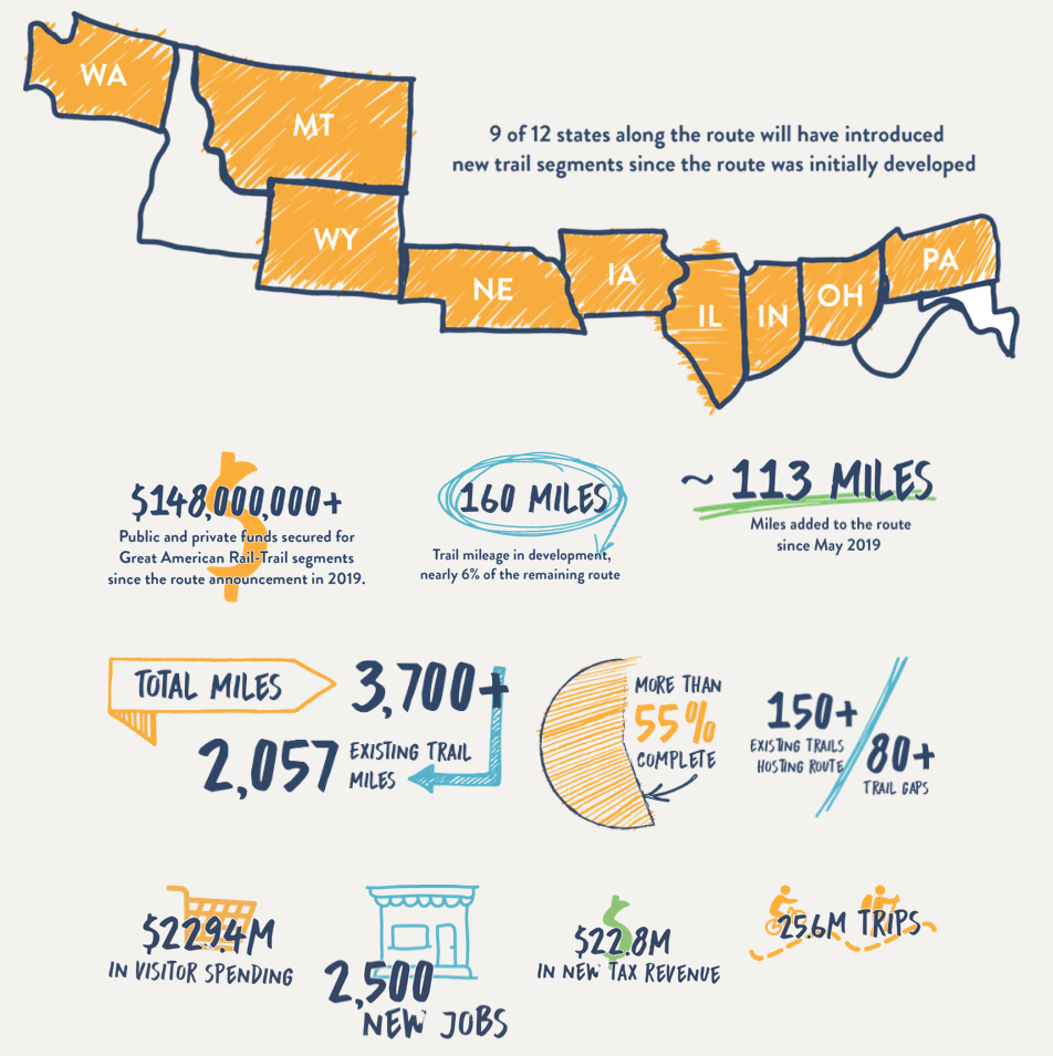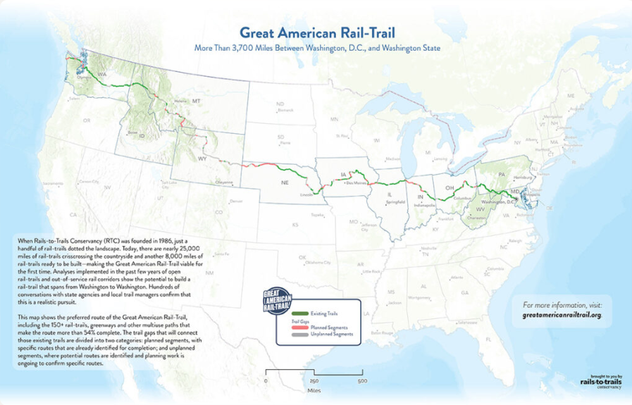 “The idea of the Great American Trail inspires people, I think because [it communicates] the idea the whole country can be woven together. But I think where it really touches the most people’s lives is the connectivity it provides all along the way,” said Kevin Mills, vice president of Policy for the Rails to Trails Conservancy. “[This trail] is linking cities and suburbs and rural areas and small towns. The political divide in our country often breaks down between rural and urban; this [issue] speaks to the importance of active transportation across all those political divides.”