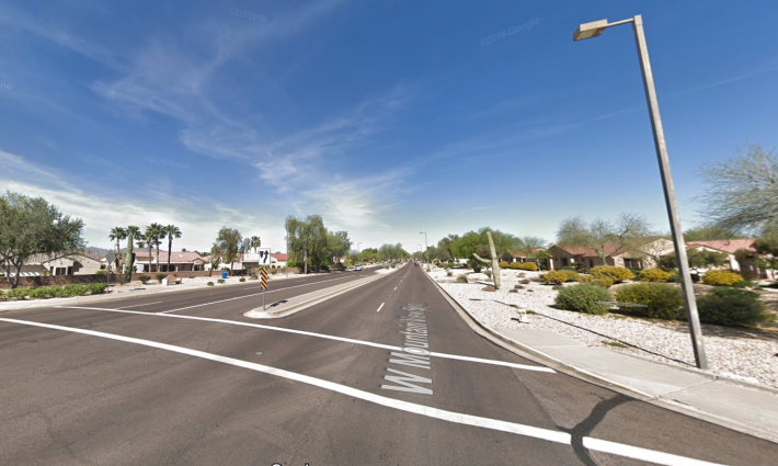 Or consider Surprise, Arizona. This city of 154,000 also appears on the DEKRA map, though its glorious year of Vision Zero certainly didn’t happen in 2018, when an unidentified male pedestrian was killed here. Note the abrupt end to the sidewalk.