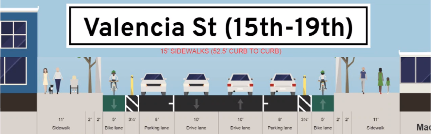 The preliminary designs show parking lanes preserved on both sides of the street in addition to two-way traffic, including from 15th to 19th where Valencia has wide sidewalks. That leaves less street width to work with, as seen in the diagram below: